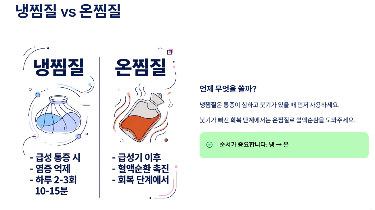 급성 통증이 줄어든 이후에는 온찜질이 도움이 됩니다. 혈액순환을 촉진해 회복 속도를 높여줍니다.