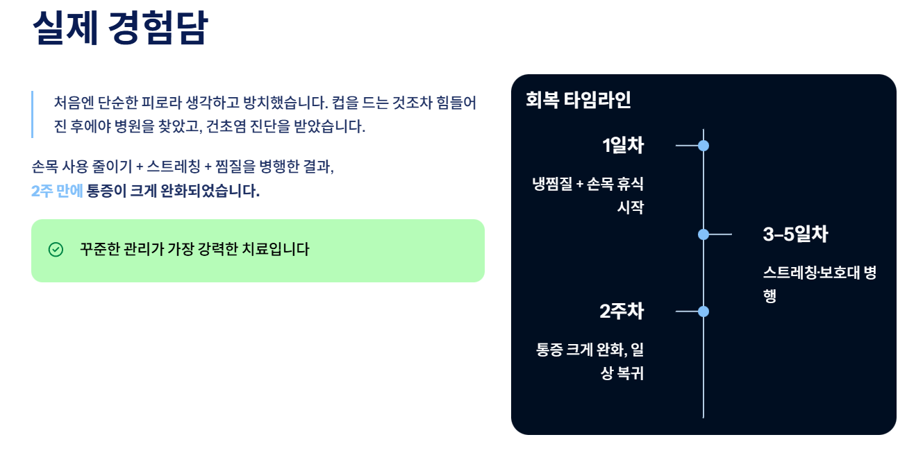처음에는 단순한 손목 통증으로 생각하고 방치했습니다. 하지만 점점 컵을 드는 것도 힘들어지고 통증이 심해져 병원을 찾게 되었죠. 건초염 진단을 받고 나서야 생활습관이 문제였다는 것을 알게 되었습니다. 이후 손목 사용을 줄이고 스트레칭과 찜질을 병행하니 2주 정도 지나면서 통증이 크게 완화되었습니다. 꾸준한 관리가 얼마나 중요한지 몸소 느끼게 된 경험이었습니다.