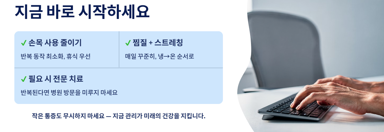 이 세 가지만 기억해도 충분히 예방과 개선이 가능합니다. 작은 통증이라도 무시하지 말고, 지금부터라도 손목 건강을 관리해보세요.