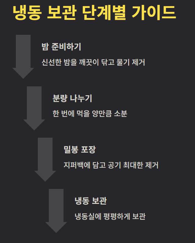 냉장이나 냉동 모두 공기 접촉을 최소화하고, 습기가 많은 환경을 피해야 합니다. 또한 장기간 보관 후에는 반드시 냄새와 상태를 확인하고, 이상이 있는 밤은 섭취하지 않아야 안전합니다.