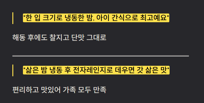 많은 사람들이 냉동 밤을 활용해 간식이나 요리 재료로 사용하고 있습니다. 실제 후기에 따르면, 껍질을 벗겨 한 입 크기로 나누어 냉동한 밤은 해동 후에도 찰지고 단맛이 그대로 유지되어 아이 간식으로도 인기가 높습니다. 또한 삶은 밤을 냉동 보관한 후 찌거나 전자레인지로 가열하면 금세 갓 삶은 맛을 느낄 수 있어 편리하다는 평이 많습니다.