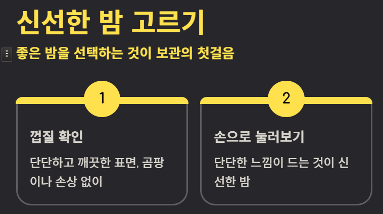밤 보관의 첫걸음은 신선한 밤을 고르는 것입니다. 껍질이 단단하고 깨끗하며, 표면에 곰팡이나 손상이 없는 밤을 선택해야 합니다. 손으로 눌렀을 때 단단한 것이 좋으며, 무게감이 느껴지는 밤일수록 속이 알차고 오래 보관할 수 있습니다.