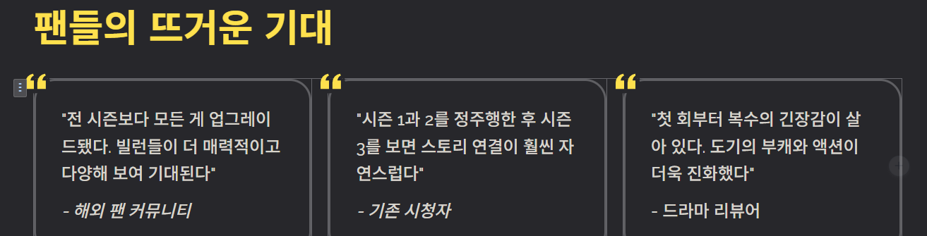 - 이전 시즌을 본 팬들은 “시즌 1과 2를 정주행한 후 시즌 3를 보면 스토리 연결이 훨씬 자연스럽다”는 의견이 많고, 일부는 “첫 회부터 복수의 긴장감이 살아 있다”고 평가합니다.
