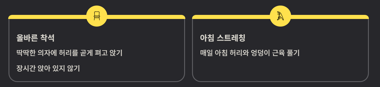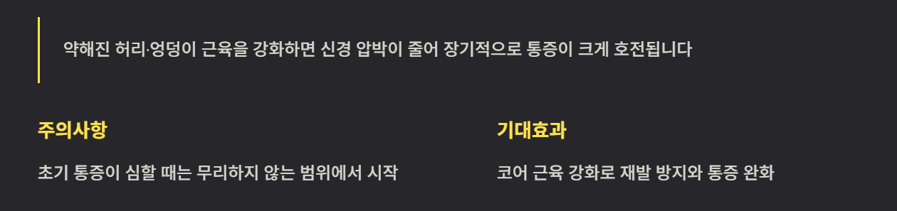 약해진 허리·엉덩이 근육을 강화하면 신경 압박이 줄어 장기적으로 통증이 크게 호전됩니다. 초기 통증이 심할 때는 무리가 되지 않는 범위에서 시작해야 합니다.