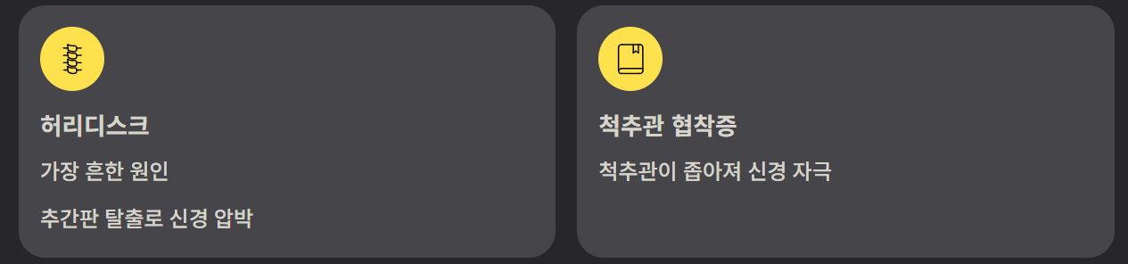 가장 흔한 원인은 **허리디스크(추간판 탈출증)**입니다. 디스크가 신경을 압박하면서 통증이 생깁니다. 척추관 협착증, 근육 긴장, 부정 자세, 고령화도 원인에 해당합니다.