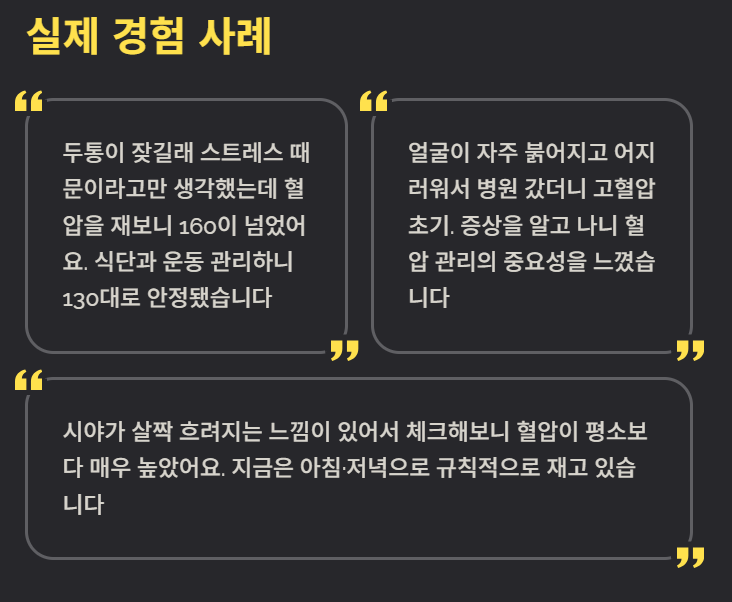 - “얼굴이 자주 붉어지고 어지러워서 병원 갔더니 고혈압 초기라고 하더군요. 증상을 알고 나니 혈압 관리의 중요성을 느끼게 됐습니다.”