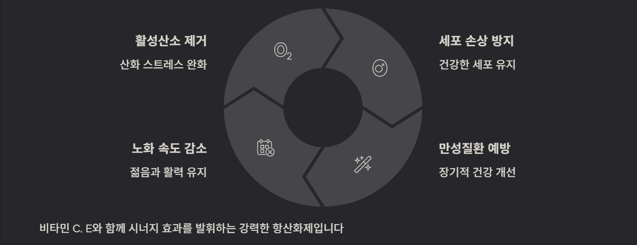 CoQ10은 비타민 C, E와 함께 세포 손상을 막는 항산화제로 작용합니다. 활성산소로 인한 산화 스트레스는 피부 노화, 세포 손상, 만성 질환 발생과 연관이 있는데, CoQ10 섭취가 이를 완화해 줄 수 있습니다.