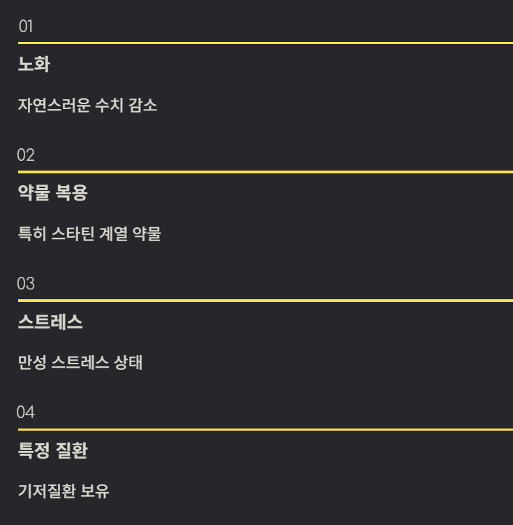 나이, 약물(특히 스타틴 계열), 스트레스, 특정 질환으로 인해 체내 CoQ10이 부족하면 피로, 심혈관 기능 저하, 근육통, 면역력 저하가 나타날 수 있습니다. 따라서 건강 상태와 연령을 고려한 보충이 필요할 수 있습니다.