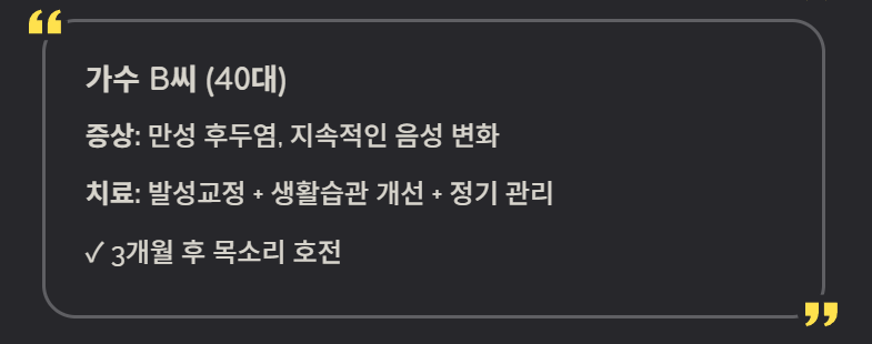 - B씨(40대, 가수)는 만성 후두염으로 지속적인 쉰 목소리. 발성 교정과 생활습관 개선, 정기 이비인후과 관리로 3개월 후 호전.