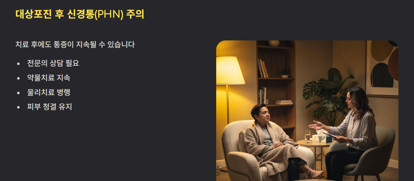 치료 후에도 **신경통(대상포진 후 신경통, PHN)**이 남을 수 있어 꾸준한 관리가 필요합니다. 통증이 장기간 지속될 경우, 전문의 상담을 통해 약물치료나 물리치료를 받을 수 있습니다. 피부는 깨끗하게 유지하고, 감염 예방을 위해 수포를 만지지 않는 것이 좋습니다.