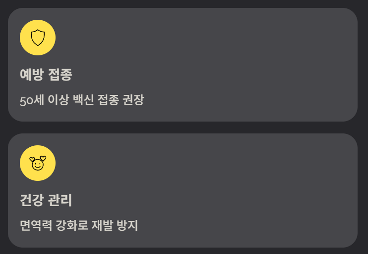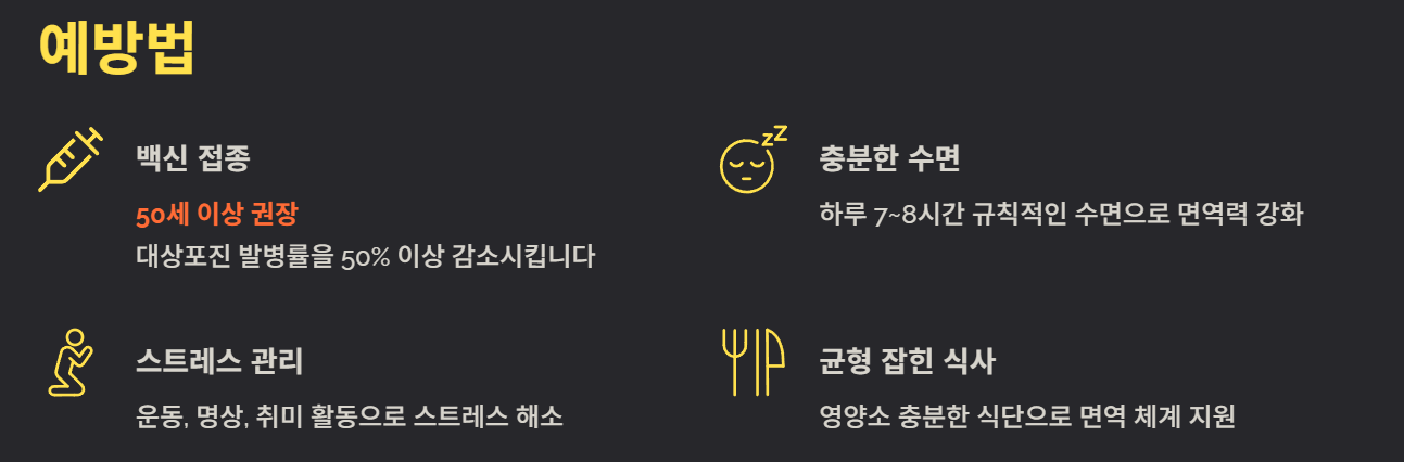 대상포진 예방에는 백신 접종이 가장 효과적입니다. 특히 50세 이상, 면역력이 약한 사람은 접종을 권장합니다. 평소 규칙적인 생활, 충분한 수면, 스트레스 관리도 발병 위험을 낮추는 방법입니다.