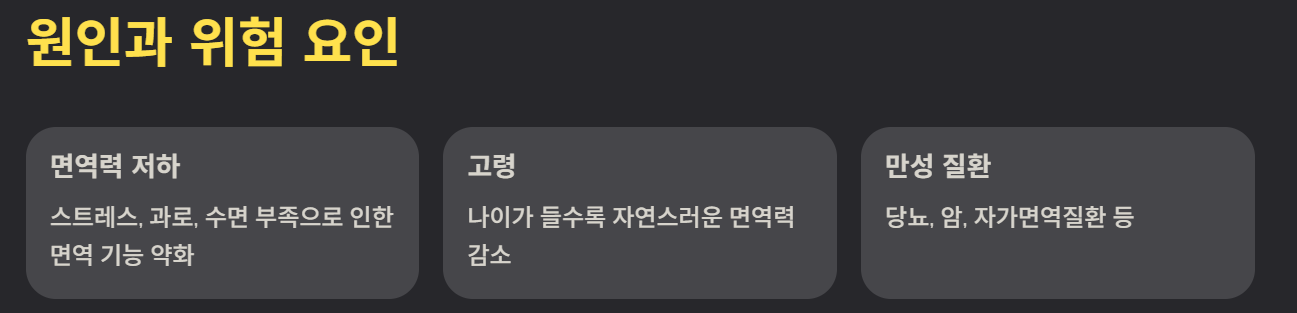 대상포진의 주요 원인은 면역력 저하입니다. 스트레스, 과로, 만성 질환, 고령 등이 위험 요인이 됩니다. 특히 암 치료, 장기이식, 면역억제제 복용 등으로 면역 기능이 약해진 사람은 발병 확률이 높습니다.