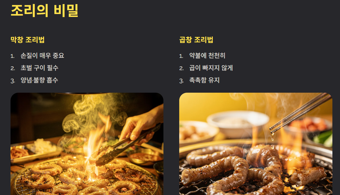 - 막창은 씹는 재미, 곱창은 풍미의 깊이가 핵심 포인트입니다.