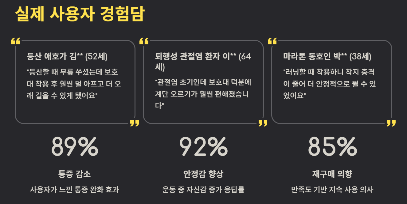- “등산할 때 무릎 쑤셨는데 보호대 착용 후 훨씬 덜 아프고 오래 걷게 됐어요.”