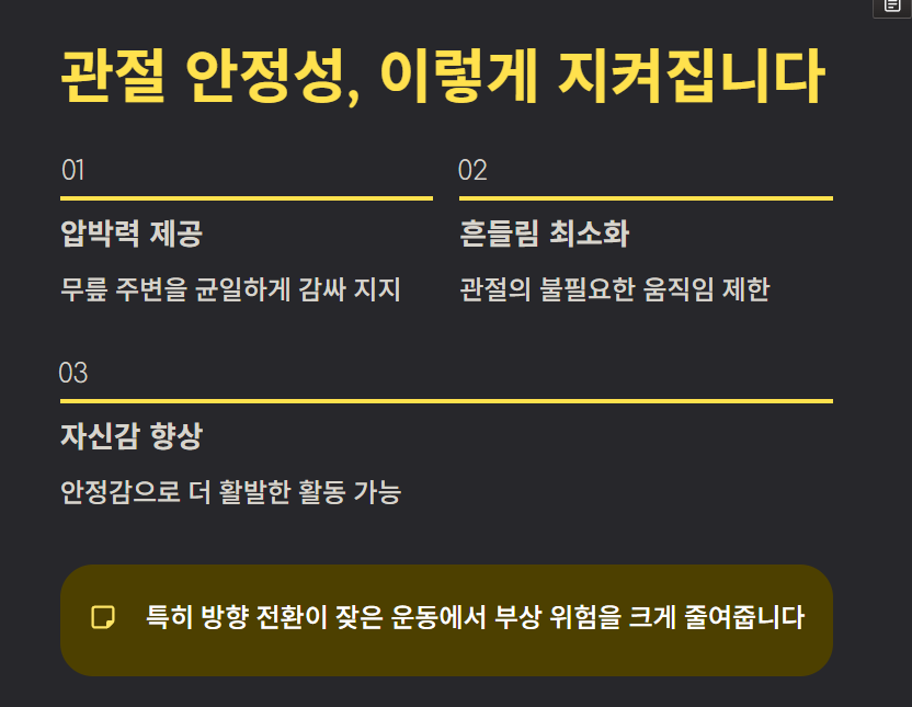 무릎보호대의 가장 큰 장점은 관절을 단단하게 잡아주는 지지력 제공입니다. 무릎 주변을 압박 형태로 감싸 흔들림을 줄여주며, 관절이 불안정한 사람이나 평소 무릎이 약한 사람에게 안정감을 줍니다. 특히 운동 중 방향 전환이 잦은 경우 부상 예방에 큰 도움을 줍니다.