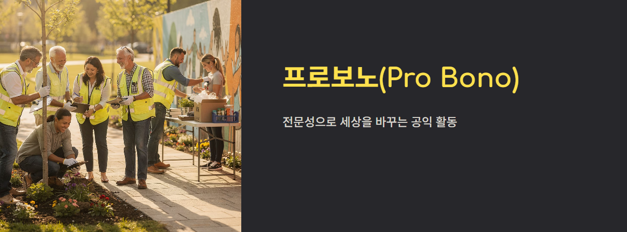 ‘프로보노’는 라틴어 Pro Bono Publico의 줄임말로, **‘공익을 위하여(For the public good)’**라는 의미입니다. 즉, 변호사·회계사·의사·디자이너 등 전문가가 자신의 전문 서비스를 무료로 제공하는 활동을 말합니다. 단순한 봉사활동이 아니라 전문 지식 기반 사회공헌이라는 점이 핵심입니다.