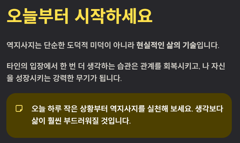 역지사지는 단순한 도덕적 미덕이 아니라 현실적인 삶의 기술입니다. 타인의 입장에서 한 번 더 생각하는 습관은 관계를 회복시키고, 나 자신을 성장시키는 강력한 무기가 됩니다. 오늘 하루 작은 상황부터 역지사지를 실천해 보세요. 생각보다 삶이 훨씬 부드러워질 것입니다.