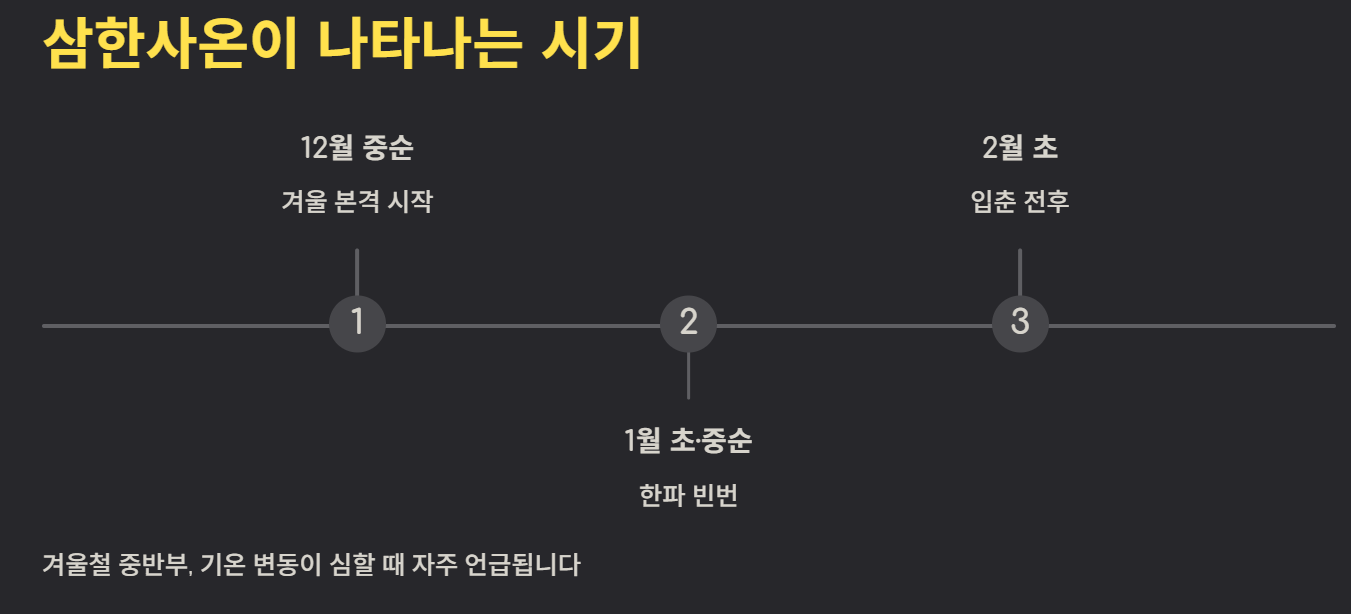 정확한 주기보다는 기온 변동이 잦은 겨울 특성을 이해하는 것이 중요하며, 이에 맞춘 옷차림과 건강 관리가 필요합니다. 삼한사온을 잘 이해하면 겨울철 컨디션 관리가 훨씬 수월해집니다.