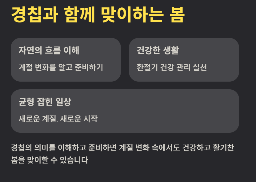 경칩은 겨울에서 봄으로 넘어가는 변화를 알려주는 중요한 절기입니다. 자연의 흐름을 이해하고 생활에 적용하면 건강 관리와 일상 계획에 도움이 됩니다. 경칩의 의미를 알고 준비한다면 계절 변화 속에서도 보다 균형 잡힌 생활을 할 수 있습니다.