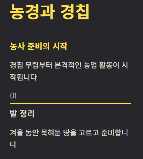 경칩 무렵부터 농사 준비가 본격화됩니다. 밭 정리, 씨앗 준비, 농기구 점검 등 실질적인 농업 활동의 출발점으로 여겨집니다.