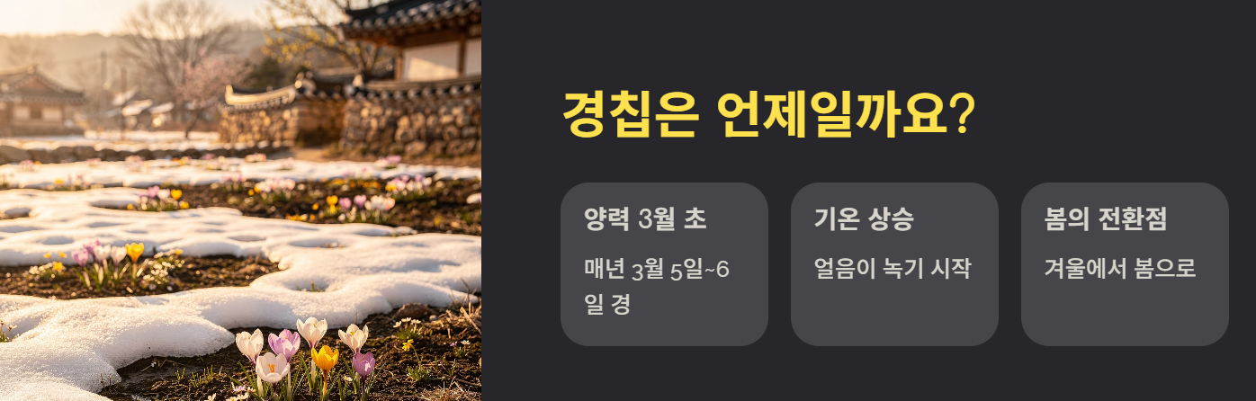 보통 양력 3월 초에 해당하며 기온이 점차 상승하고 얼음이 녹기 시작하는 시기입니다. 지역에 따라 체감 온도 차이가 있으나 봄으로 넘어가는 전환점입니다.