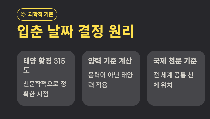 입춘 날짜 알아보기의 핵심은 태양의 위치입니다. 태양 황경이 315도에 도달하는 시점을 입춘으로 정하며 양력 기준으로 계산됩니다.