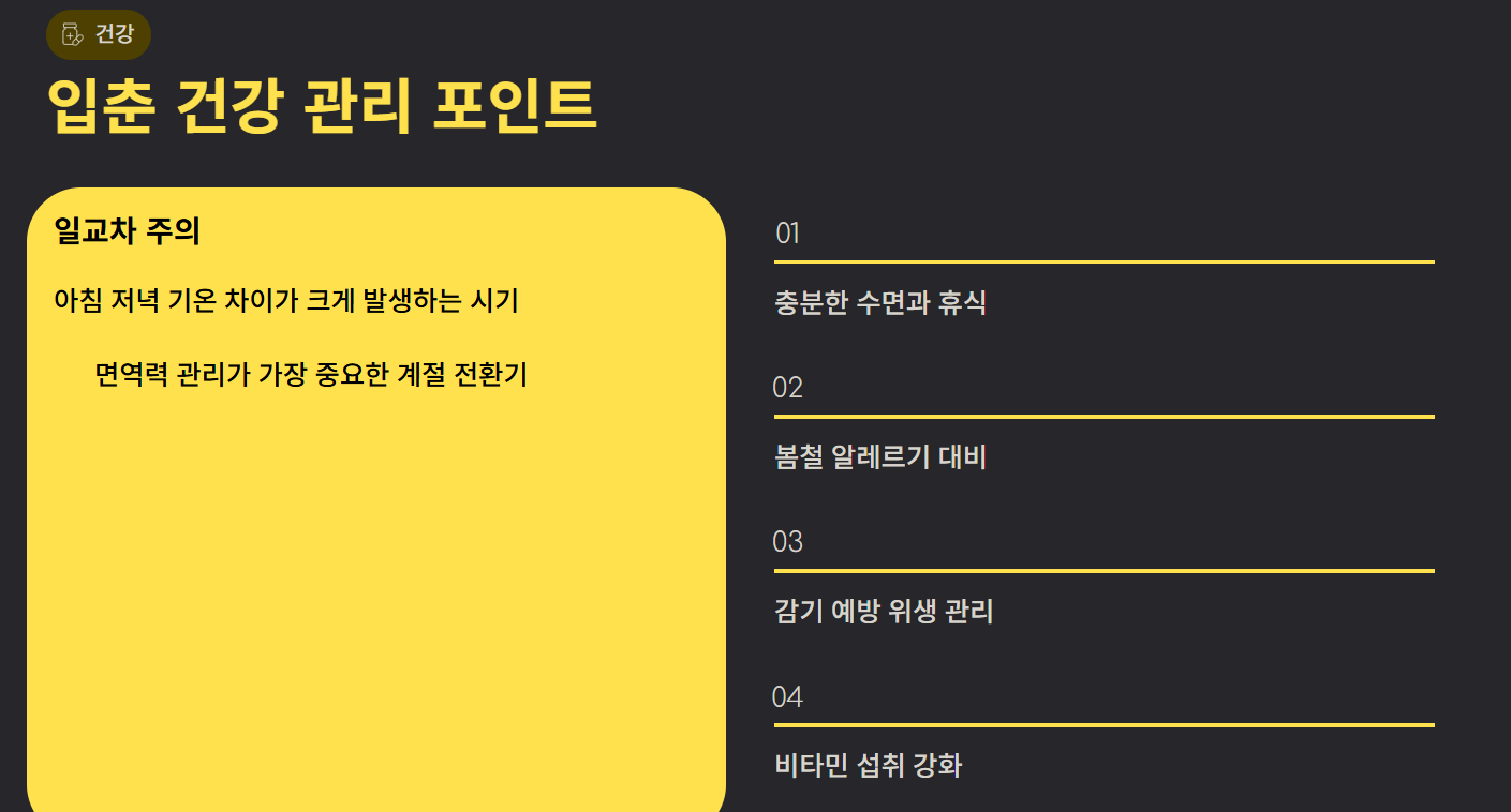 입춘 이후 일교차가 커지기 때문에 면역 관리가 중요합니다. 봄철 알레르기, 감기 예방 준비 시기로도 알려져 있습니다.