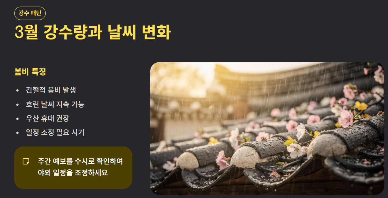 3월은 비가 자주 내리지는 않지만 간헐적 봄비가 발생합니다. 흐린 날이 이어지는 경우도 있어 일정 계획 시 참고해야 합니다.