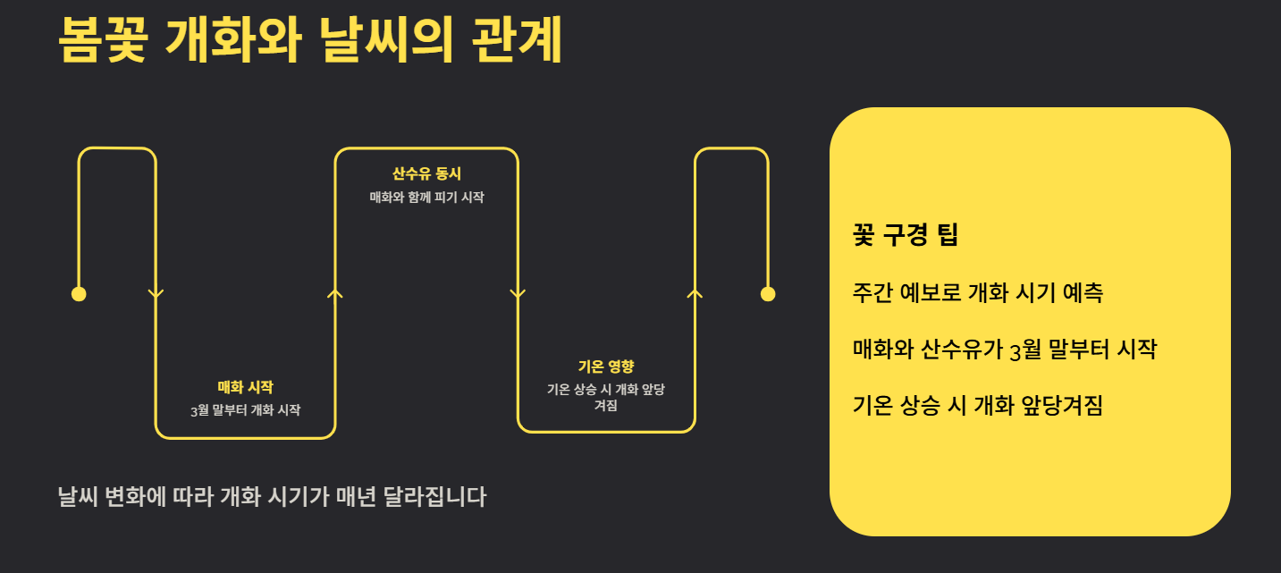 3월 말부터 매화와 산수유가 피기 시작합니다. 날씨 변화에 따라 개화 시기가 달라지므로 주간 예보 확인이 필요합니다.