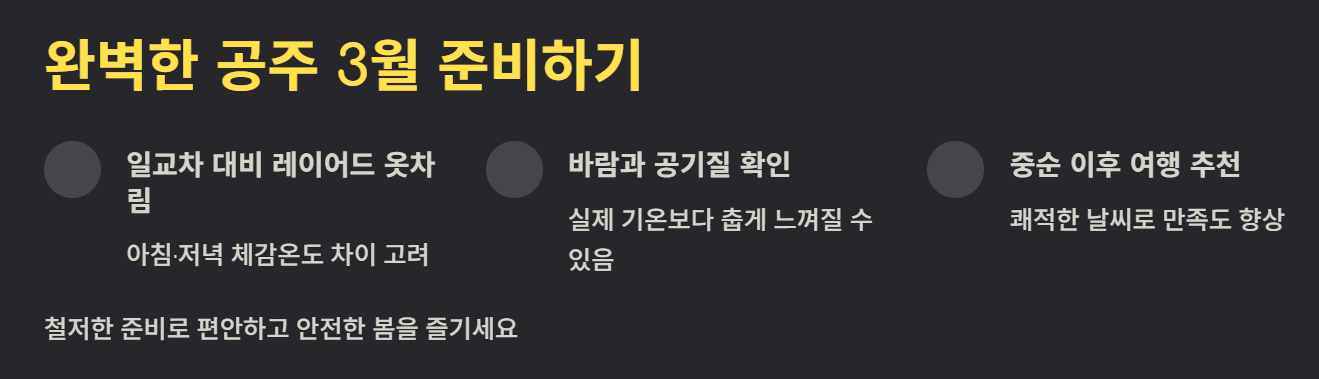 공주 3월 날씨 알아보기는 여행과 일상 준비에 필수 정보입니다. 일교차가 크고 바람이 강한 특성이 있어 옷차림과 일정 계획을 세밀하게 준비해야 합니다. 공주 3월 날씨 알아보기를 통해 보다 편안하고 안전한 봄을 맞이할 수 있습니다.