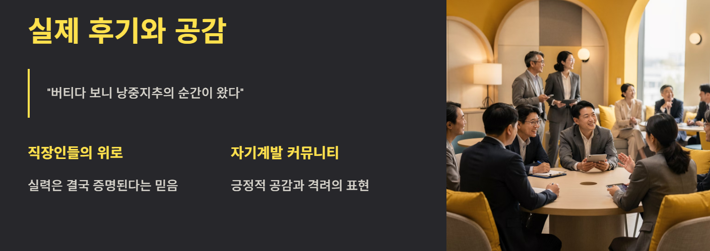 자기계발 커뮤니티나 취업 후기 글을 보면 “버티다 보니 낭중지추의 순간이 왔다”라는 표현이 자주 등장합니다. 특히 직장인이나 프리랜서들 사이에서 실력은 결국 증명된다는 위로와 공감의 의미로 긍정적인 평가를 받고 있습니다.