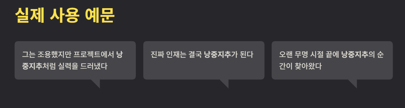이처럼 한자 하나하나를 살펴보면 의미가 매우 직관적이며, 비유적 표현이 뛰어난 사자성어임을 알 수 있습니다.