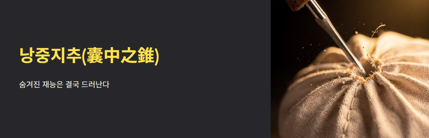 낭중지추란 주머니 속의 송곳이라는 뜻으로, 아무리 감추려 해도 날카로운 송곳 끝은 결국 튀어나온다는 의미입니다. 즉, 진짜 실력이나 재능은 숨기려 해도 자연스럽게 드러난다는 뜻으로 사용됩니다.