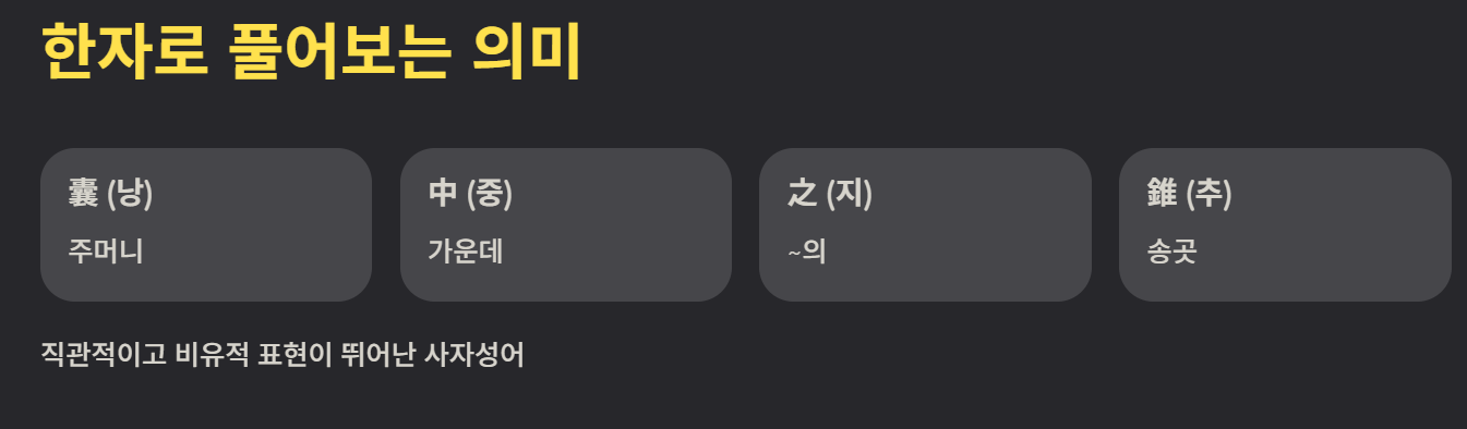 낭중지추는 이 중에서도 자연스럽게 드러난다는 뉘앙스가 가장 강합니다.