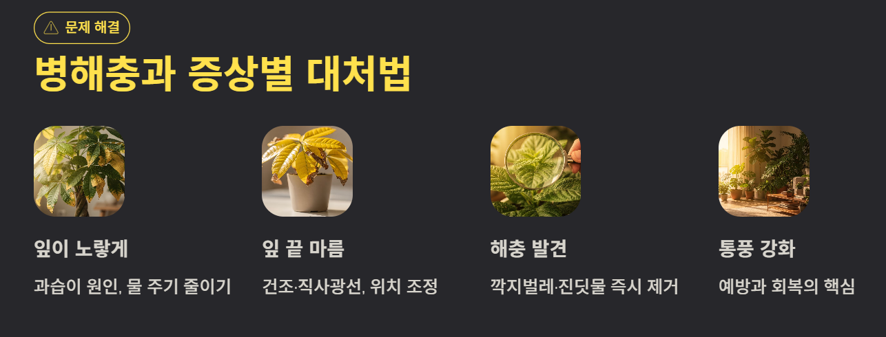 잎이 노랗게 변하거나 떨어지는 경우 대부분 과습이 원인입니다. 잎 끝이 마르면 건조 또는 직사광선 문제일 수 있습니다. 깍지벌레나 진딧물이 생기면 즉시 제거하고 통풍을 강화하세요. 조기 대응이 파키라를 오래 키우는 핵심입니다.