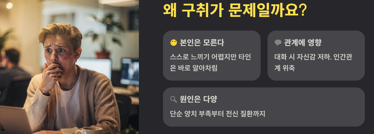 입냄새심한이유가 궁금하신가요? 일상생활에서 대화를 할 때 가장 신경 쓰이는 부분이 바로 구취입니다. 스스로는 잘 느끼지 못하지만 타인은 쉽게 알아차릴 수 있어 인간관계와 자신감에 영향을 줄 수 있습니다.