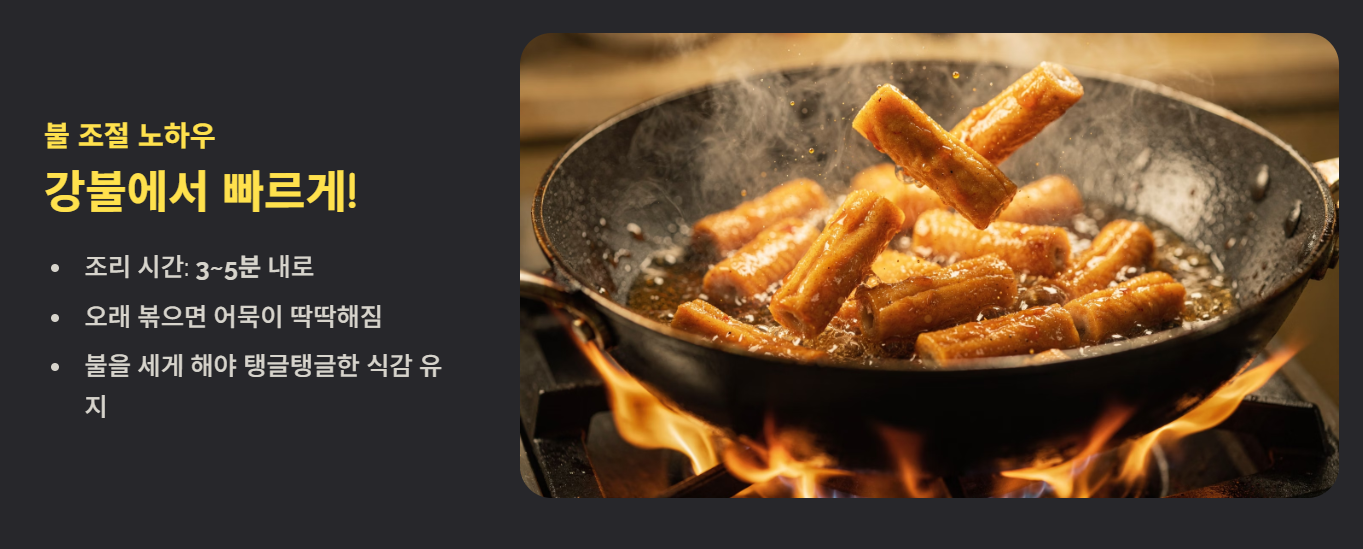 강불에서 빠르게 볶는 것이 중요합니다. 오래 볶으면 어묵이 딱딱해지고 질겨질 수 있으니 3~5분 내로 조리하는 것이 좋습니다.