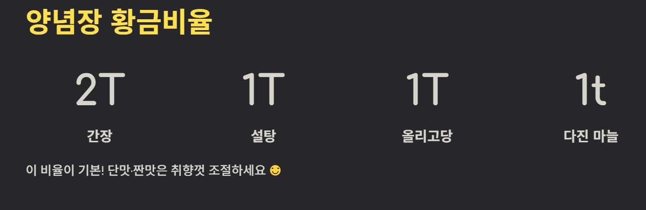 이 비율을 기본으로 하되, 단맛과 짠맛은 개인 취향에 맞게 조절하세요.