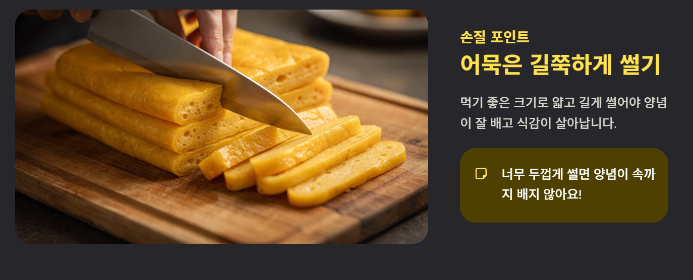 어묵은 먹기 좋은 크기로 길쭉하게 썰어주는 것이 식감이 좋습니다. 너무 두껍거나 크게 썰면 양념이 잘 배지 않기 때문에 적당한 두께를 유지하는 것이 핵심입니다.