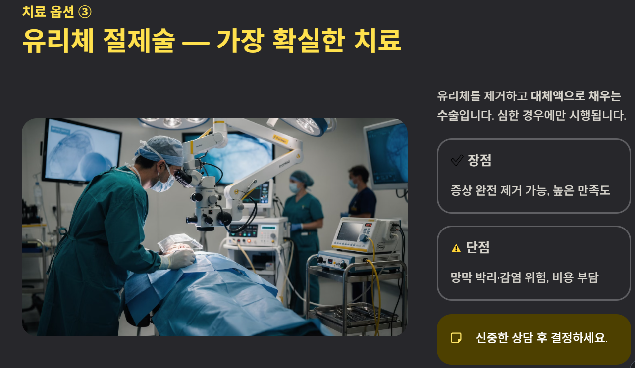 가장 확실한 치료법으로, 유리체를 제거하고 대체액으로 채우는 수술입니다.