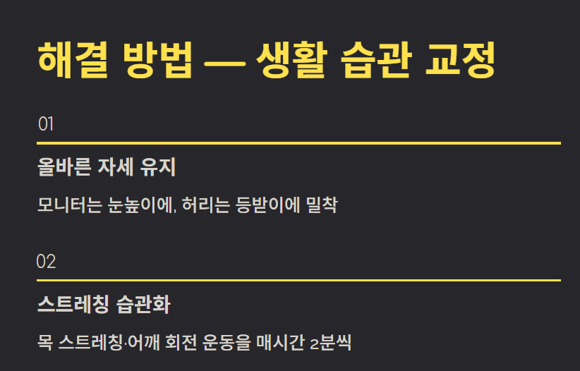 대표적인 방법으로 목 스트레칭과 어깨 회전 운동이 효과적입니다.