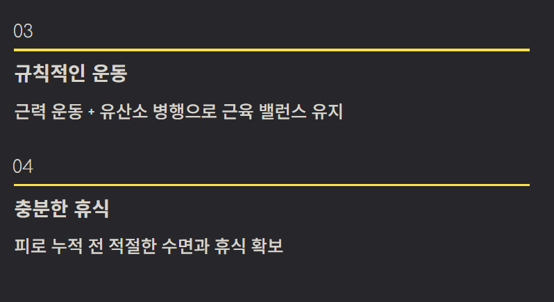 피로가 누적되지 않도록 휴식 시간을 확보해야 합니다.