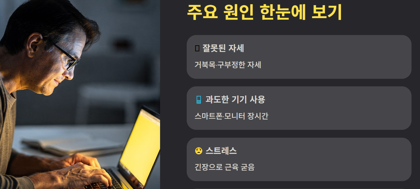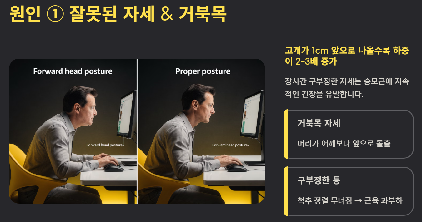 장시간 고개를 숙이거나 구부정한 자세를 유지하면 승모근에 지속적인 긴장이 발생합니다. 특히 거북목 자세는 대표적인 원인입니다.