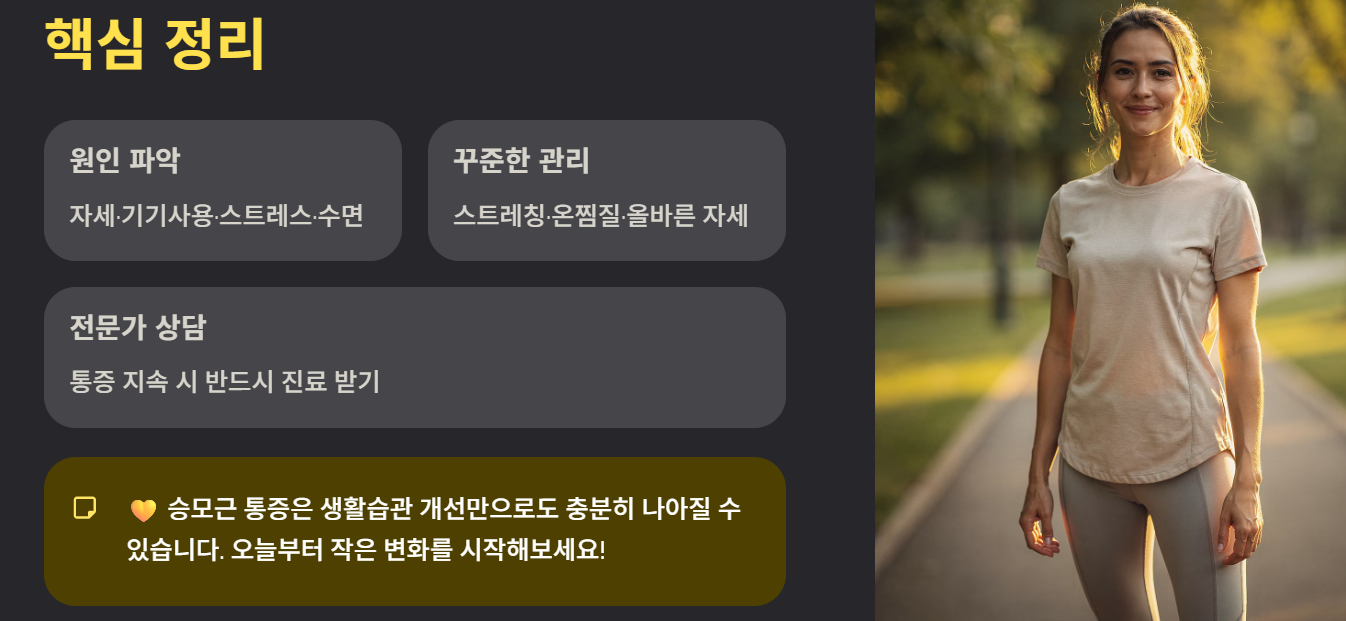 승모근 통증은 잘못된 생활습관에서 비롯되는 경우가 많지만, 꾸준한 관리로 충분히 개선할 수 있습니다. 자세 교정, 스트레칭, 생활습관 개선을 병행하는 것이 핵심입니다. 만약 통증이 오래 지속되거나 심해진다면 반드시 전문가의 진단을 받아야 합니다.