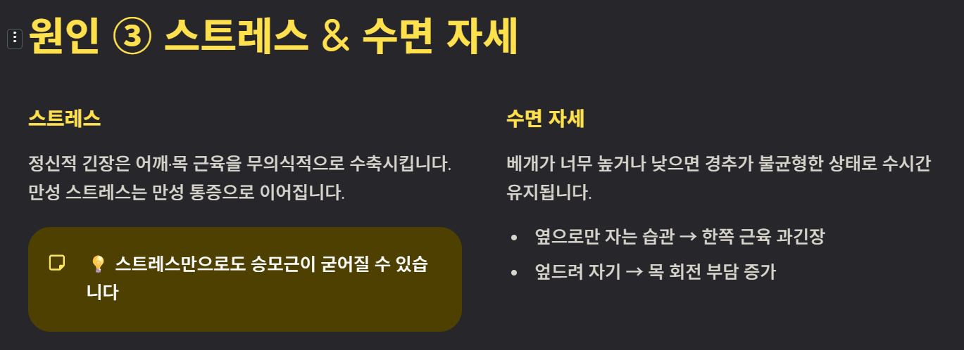 스트레스는 근육 긴장을 유발합니다. 특히 어깨와 목 주변 근육이 굳어지면서 통증이 심해질 수 있습니다.