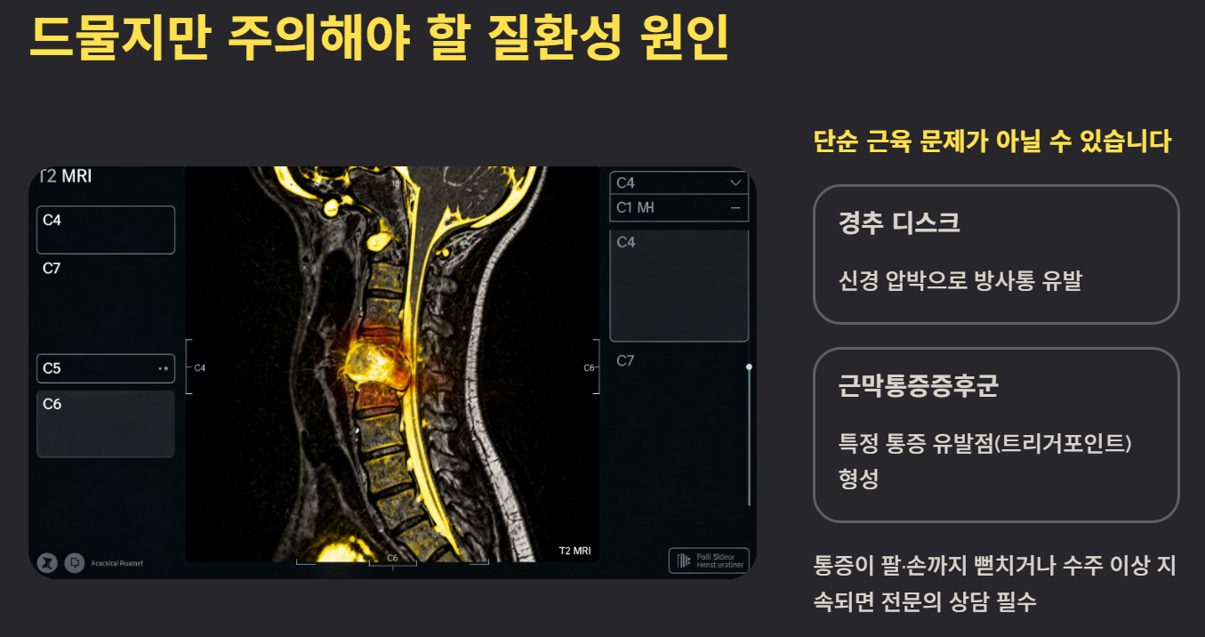 드물지만 경추 디스크나 근막통증증후군 같은 질환이 원인이 될 수도 있습니다.
