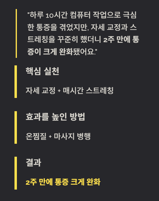 직장인 A씨는 하루 10시간 이상 컴퓨터 작업을 하면서 심한 승모근 통증을 겪었습니다. 하지만 자세 교정과 스트레칭을 꾸준히 시행한 결과 약 2주 만에 통증이 크게 완화되었습니다. 특히 온찜질과 마사지 병행이 효과적이었다고 합니다.