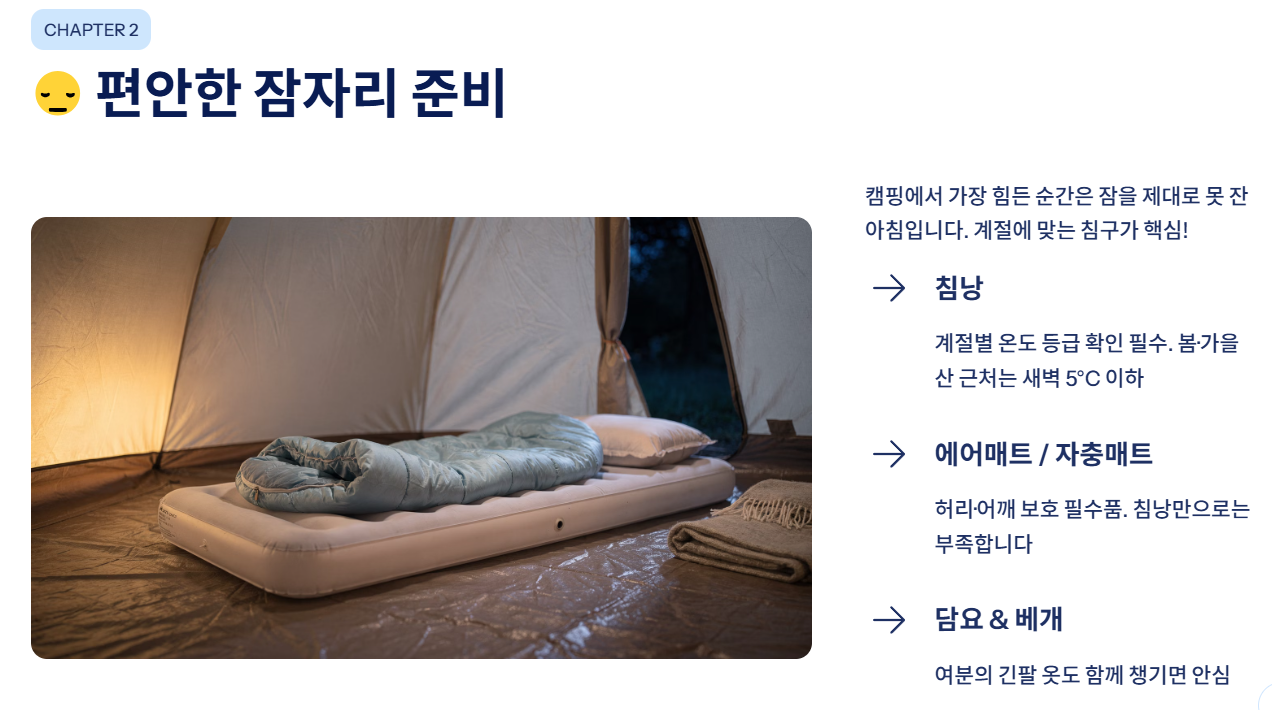 캠핑에서 가장 힘든 순간은 잠을 제대로 자지 못했을 때입니다. 바닥이 딱딱하거나 밤기온이 떨어지면 생각보다 훨씬 추울 수 있습니다.
