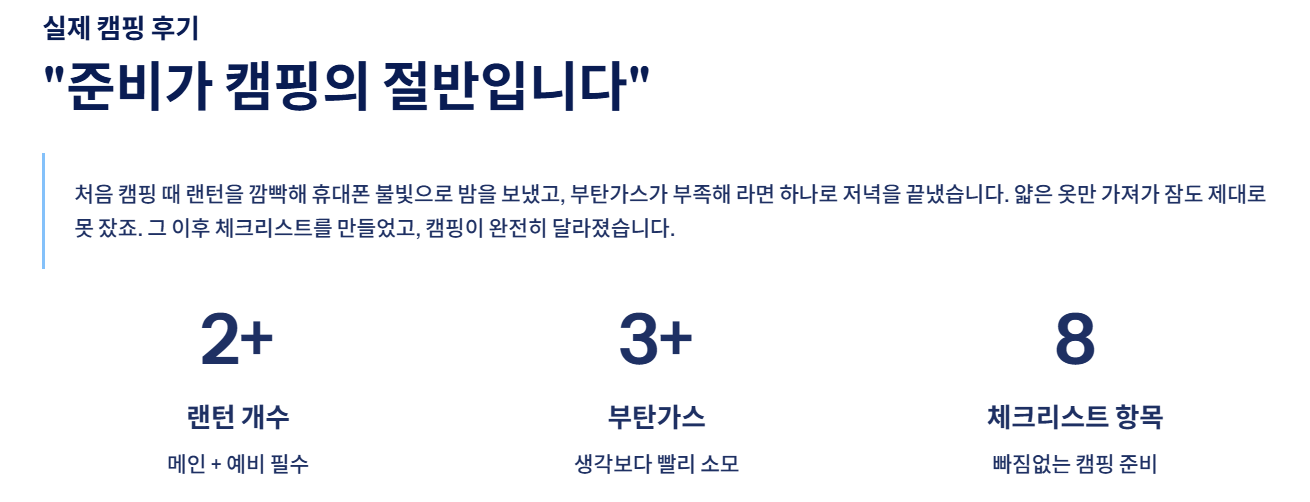 그 이후에는 캠핑 준비물 체크리스트를 미리 만들어두고 출발 전 다시 확인했습니다. 그 결과 빠뜨리는 물건이 거의 없어졌고, 훨씬 편안하고 즐거운 캠핑을 할 수 있었습니다. 특히 랜턴, 침낭, 부탄가스, 물티슈는 꼭 여유 있게 챙기는 것이 가장 중요했습니다.