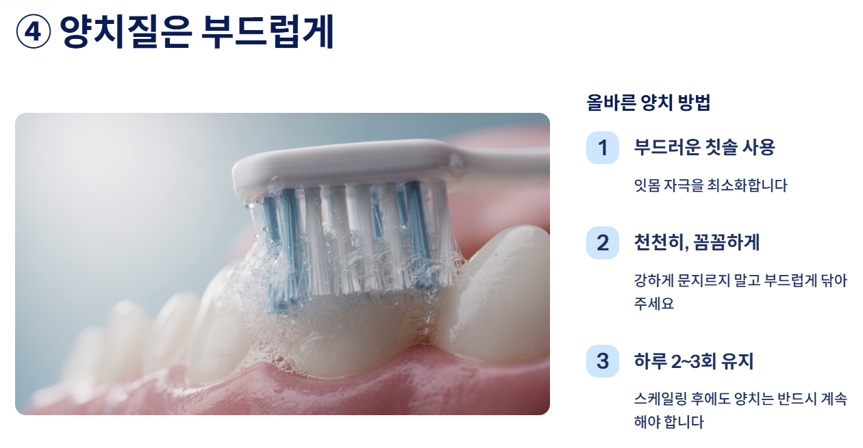 스케일링 후에도 양치질은 필수입니다. 다만 너무 강하게 하면 잇몸에 자극을 줄 수 있으므로 부드러운 칫솔로 천천히 닦아주세요.